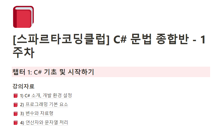 하여튼 간에 오늘은 조도 바뀌고, 이번 주 같은 경우에 강의를 듣고 C#에 대해서 집중적으로 공부하는 주이기 때문에 과제도 개인 과제더군요. 새로 만난 팀원분들이랑 여러 가지로 이야기를 하고 싶었는데... 아니나 다를까 다들 I의 성격을 가지셨는지 조용합니다... 저번 주에 있었던 조가 특별했던 거였어요. 그래도 채팅으로 인사를 했지만, 다들 개인 강의를 들으시느라 알아채지 못하셨습니다. 그래서 저도 하루를 빠진 만큼 따라가야 했기 때문에 저번 주에 지급받았던 C# 문법 종합반 강의를 1주 차부터 듣기 시작했습니다.