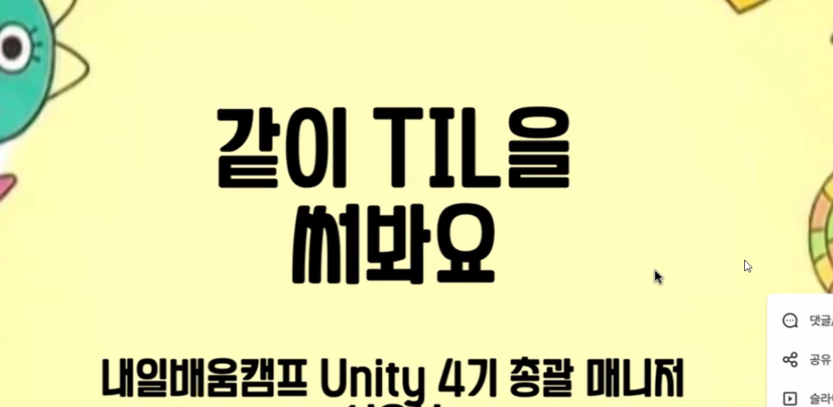 강의가 끝난 뒤에는 2주 차 강의를 들었고, 5시부터 신우석 매니저님께서 준비해 주신 TIL 쓰는 법에 대한 강의를 들었습니다. 우석 매니저님께서 TIL을 왜 써야 하는지, 어떻게 쓰는지를 자세히 설명해 주시고, 다른 매니저분들의 예시를 보여주시면서 쓰면 된다고 하셔서 어떻게 써야 할지 대충 감이 잡히더군요. 저는 일기 형식이 익숙하다 보니 아마 계속 이런 식으로 쓰지 않을까 합니다.