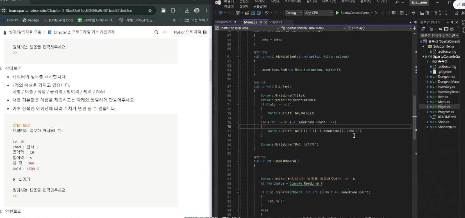 그리고 BaseMonster에서 Menu로 전달해 줄 수 있는 정보를 함수로 만들었고, 지금까지 했던 내용들을 팀 노션 페이지에 정리했습니다. 일단 구조만 만들면 되는 작업이었기에 크게 어려운 점은 없었습니다. 다만 이후에 만들어야 할 배틀 시스템이 던전이나 메뉴를 수정해야 할 것이 많은 것 등 여러 가지로 문제가 많았습니다. 또한 인터페이스와 추상 클래스로 받아 온 만큼 각각의 몬스터의 행동에 차별화를 둬야 하는데, 텍스트 RPG 특성상 한계가 있는 문제도 있었습니다.