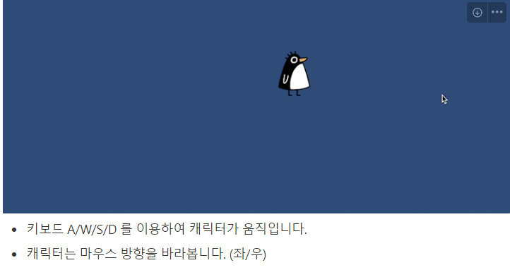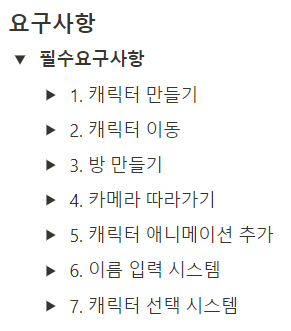 저는 필수요구사항만으로도 벅찼기 때문에 선택요구사항은 일단 보진 않았습니다. 그래서 캐릭터 만들기나 이동, 방 만들기 같은 경우에는 강의에서 배웠던 내용들을 다시 쓰면서 구현을 했고, 카메라 따라가기 같은 경우에는 강의에서 나오지 않았던 내용이었기 때문에 검색을 통해서 배우고 적용했습니다.