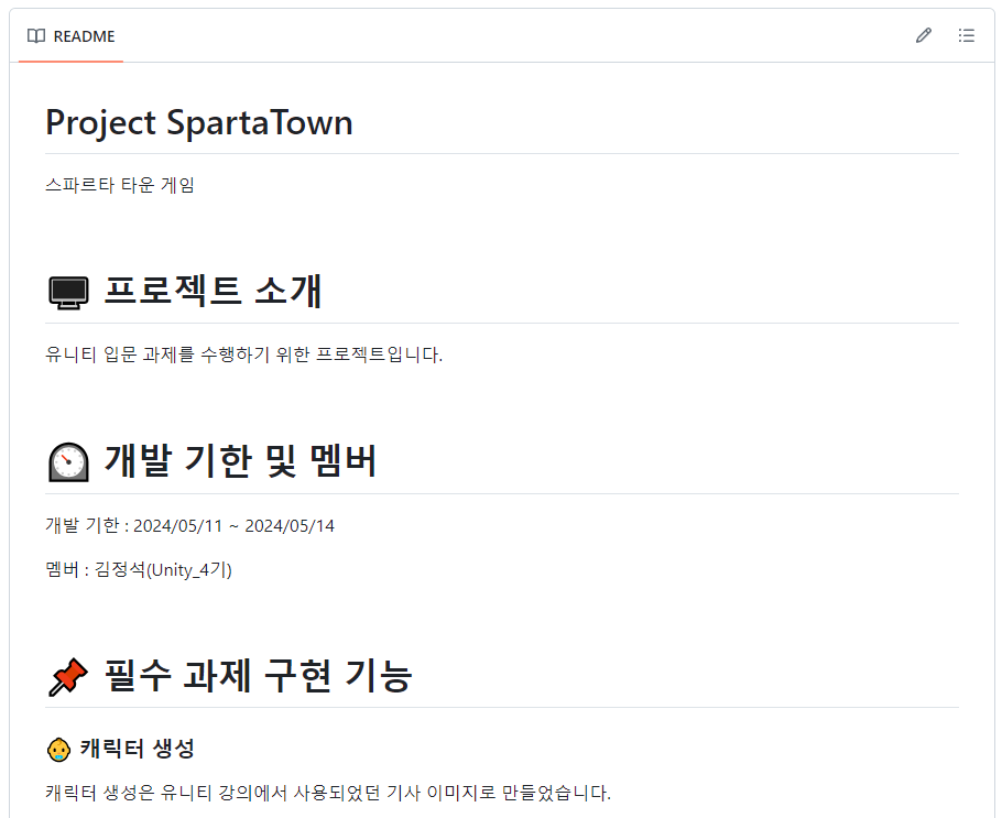 그다음, 남은 시간에는 GitHub에 있는 ReadMe를 간단하게 정리하고, 과제 제출 시간이었던 12시가 되어 제출하고, 끝냈습니다. 점심 먹기 전까지는 불필요한 에셋 삭제나 GitHub 정리를 했고, 점심 먹고 난 후에는 과제 해설 영상이 올라올 때까지 지급받았던 강의를 마저 다 보게 됐습니다.