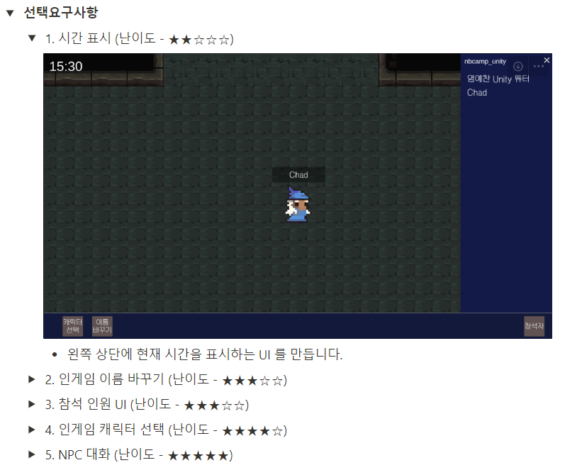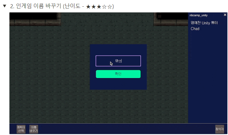 참석 인원 UI의 경우 NPC가 없었던 점이나 시간이 없었던 관계로 넘어갔고, 인게임 캐릭터 선택도 이름 입력창과 마찬가지로 기존에 쓰던 창을 재활용해서 바꿀 수 있도록 적용했습니다.