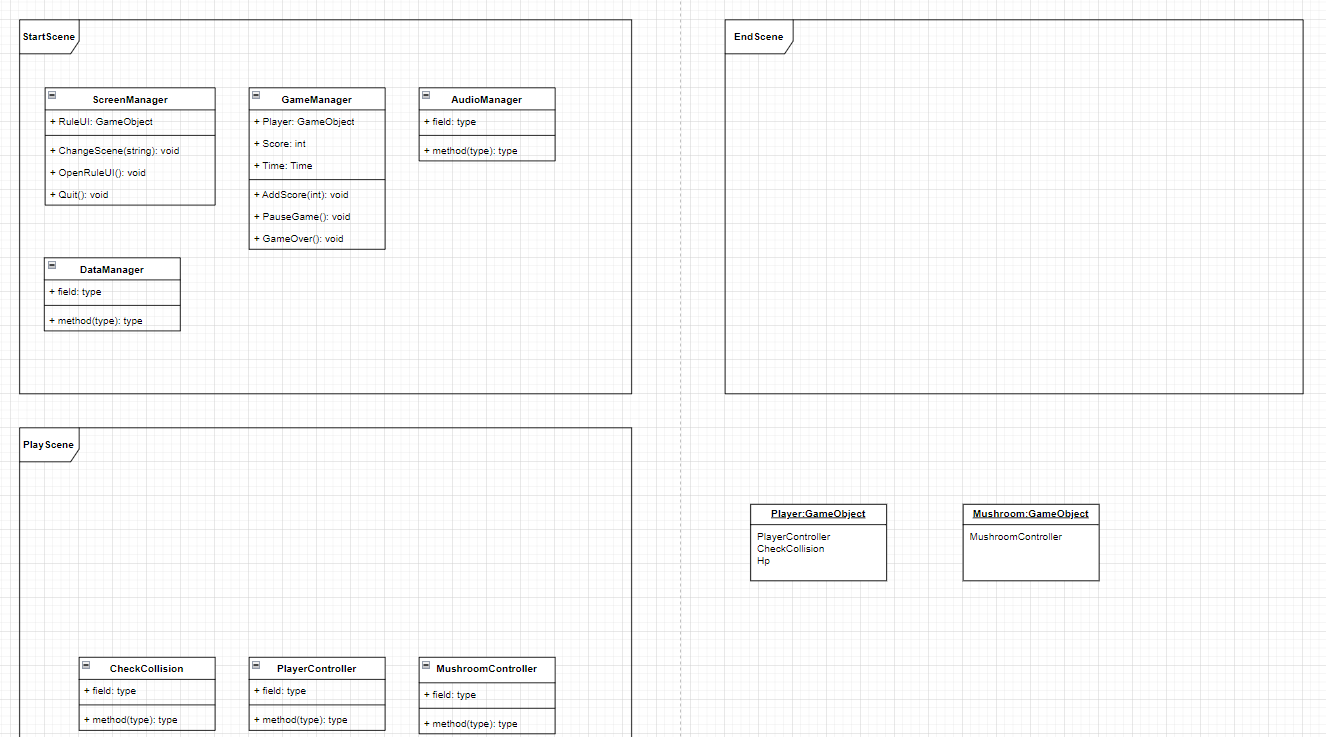 점심을 먹고, 객체 지향 특강을 듣고 나서 저희는 UML에 대한 회의를 진행했습니다. 여러가지 의견들이 나오긴 하나 다들 경험이 많이 없었기 때문에 어떤 식으로 설계를 해야 하는지 몰라서 다 같이 튜터님께 찾아가 조언을 구했습니다. 그렇게 나온 결론은 3개의 씬에서 가져가야 할 큰 클래스와 세부적으로 들어가야 하는 클래스를 구성해서 만들게 됐습니다. 선택 기능의 경우에는 일단 생각하지 말고, 기본적인 버섯 피하기의 시스템을 만든 다음에 추가하는 것으로 결론을 내렸습니다. 그다음에는 한 분이 대표로 GitHub를 팀으로 만들어 주셨고, 연동을 하는 과정에서 문제가 있었지만, 팀원 전원이 연동을 다 하고 기본적으로 필요한 세팅을 제외하고, 각자 이야기를 나누며 TIL 쓰는 것으로 마무리했습니다.