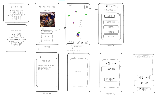 게임을 선정하고 나서 저희는 바로 노션에 S.A 페이지를 만들고 프로젝트 명과 설명, 와이어 프레임, UML을 채워나갔습니다. 일단 프로젝트 명의 경우, 저희 조의 이름이 롤대남이었기 때문에, 롤에 관련된 아이디어를 바탕으로 "티모 버섯 피하기"라는 이름의 프로젝트를 구성하게 됐습니다. 그리고 와이어 프레임은 3개의 씬을 만들어서 어떤 식으로 만들면 좋을지에 대한 이야기와 필수 구현 및 선택 기능에 무엇을 하면 좋을지에 대해서 이야기를 나누어서 위의 와이어 프레임으로 진행하게 되었습니다.