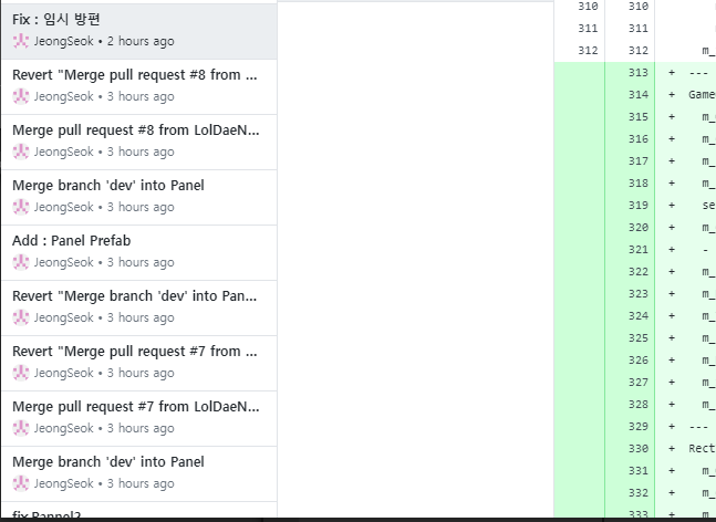 그런데... 같은 씬에서 작업해서 그런지, 유니티 씬 부분에서 충돌이 많이 일어나게 됐고, 스크립트의 경우 보면서 해결은 했지만, 씬에 해당하는 충돌은 일단 다 넣어서 확인해봤습니다. 그렇게 확인해 본 결과, 다른 분이 작업하신 일시 정지 패널이 사라져 버렸고, 몇 개 오류가 터지게 됐습니다. 그래서 저는 Revert changes in commit으로 돌려놓고, 어떻게든 복구하려고 했으나 잘 안 돼서 새로 만드신 오브젝트만 살리고 코드는 다시 작성하고, 오류가 있으면 수정하는 것으로 마무리했습니다.