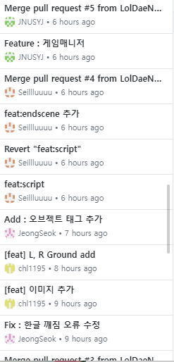 오후에는 다시 회의를 통해서 제가 점수 시스템을 맡아서 작업을 진행하게 됐습니다. 게임이 플레이 중에는 왼쪽 상단에 점수가 뜨고, 게임이 끝나면 EndScene으로 이동해 점수가 적용되는 로직을 추가했고, 다른 분들도 맡으신 작업이 끝나서 Pull Request 후, Merge 했습니다.