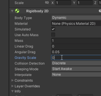 (4) 스크립트 추가와 Rigidbody2D 추가 : 위의 간단한 이동 로직 스크립트를 추가 한 후, Rigidybody2D도 추가하여 Gravity Scale을 0으로 만들어준다.