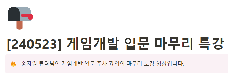 저는 일단 입문 주차에 대한 내용들 중 이해를 못하고 넘어간 것이 좀 있어서 송지원 튜터님께서 준비해 주신 마무리 특강을 들었습니다. 강의 내용에는 GetComponent와 싱글톤에 대한 내용, 그리고 Input System에 대한 내용도 있었고, 개인적으로는 약간 부족한 점이 있었기 때문에 강의 내용이 많은 도움이 되었던 강의였습니다. Input System에 대해서는 하단에 간단하게 남겨볼 생각입니다.