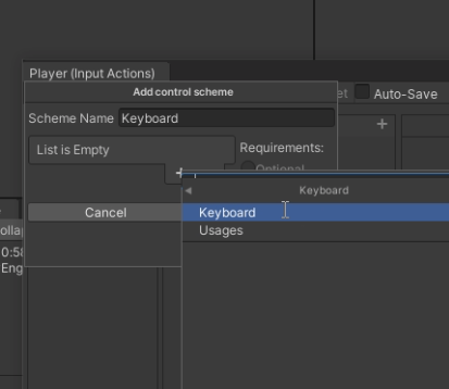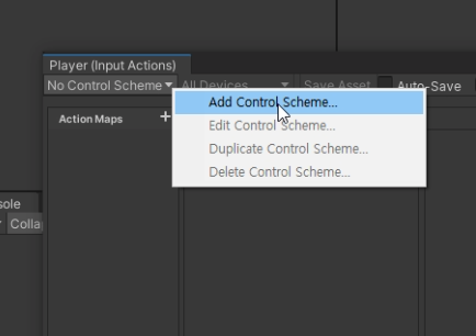 (2) 컨트롤 기기 추가 : 생성된 Input Actions 에셋을 더블 클릭하여 열고 'No Control Scheme'을 클릭 후, 'Add Control Scheme...'를 클릭 한다. 그다음에 사용할 기기의 이름을 입력한 뒤, '+' 버튼을 눌러 오른쪽 마우스로 Keyboard를 추가한다. (왼쪽 클릭 안먹힘.)