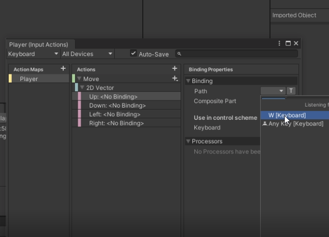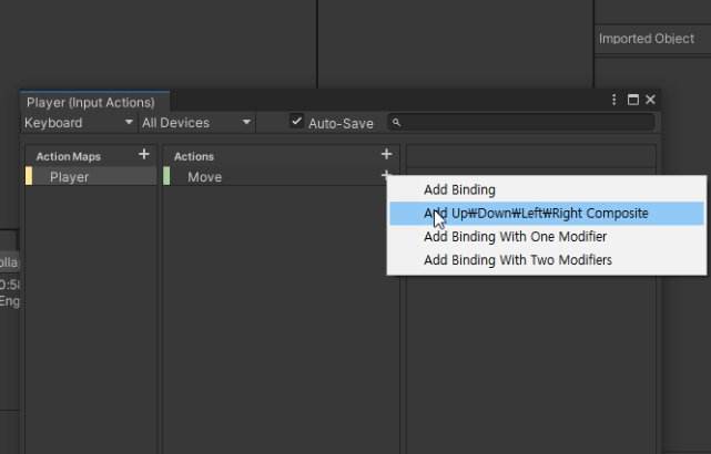 (4) 바인딩 추가 및 설정 : Move 액션의 오른쪽 작은 '+' 버튼을 눌러 Up, Down, Left, Right Composite를 추가해준다. 그리고 각각의 Path에 이동과 관련된 키보드 Key를 넣어준다.
