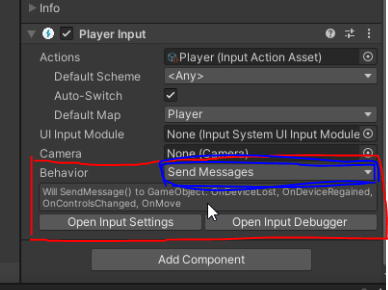(3) Behavior 설정 : Behavior 필드를 통해 입력 처리 방식을 설정한다. (Send Messages, Unity Events, Invoke C# Events 등).