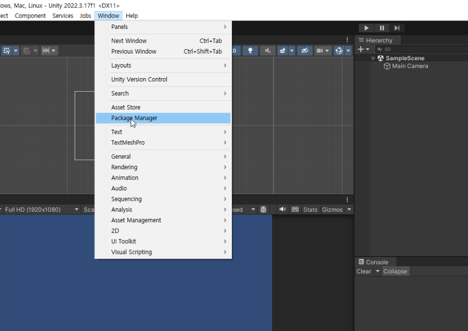 (1) 패키지 매니저 열기 : 'Window → Package Manager'를 클릭한다.