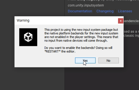 - 설치가 완료되면, 유니티가 기존의 Input Manager에서 새로운 Input System으로 전환할 것인지 묻는 팝업이 나타난다.