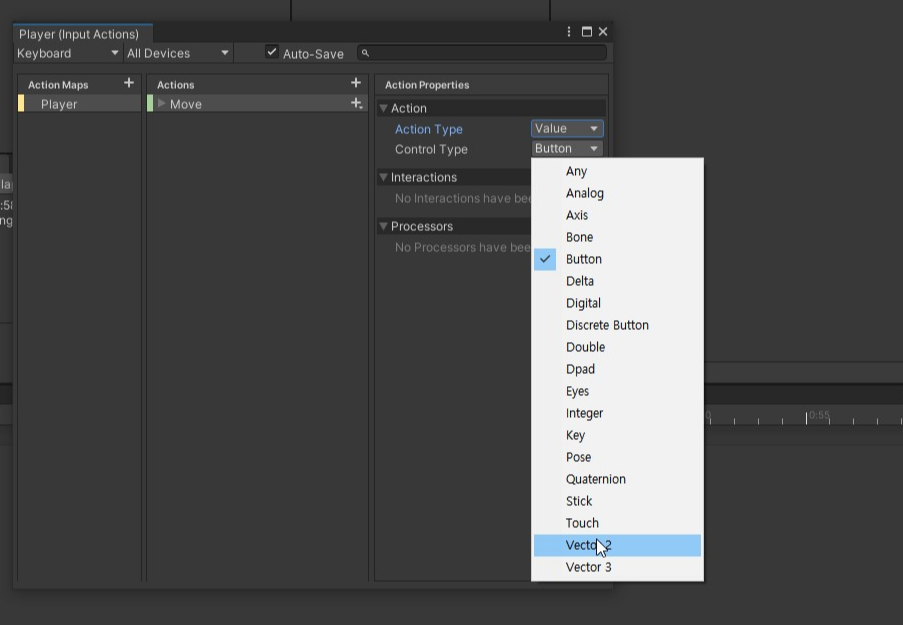 (3) 액션 맵 및 액션 추가 : 액션 맵(Action Map)을 추가한 후, 각 액션(Action)을 정의한다. 이동을 위해서 Value로 변경 후, Vector2로 바꿔준다.