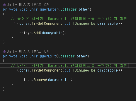 2. 성능 : TryGetComponent는 GetComponent와 유사한 성능을 제공하며, 추가적인 예외 처리가 필요 없기 때문에 코드가 더 간결해진다.