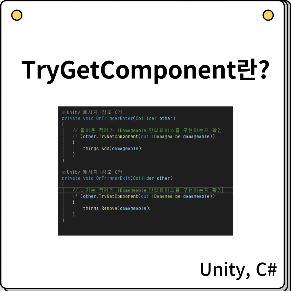 - Unity에서 제공하는 메서드로, 게임 오브젝트(GameObject)에서 특정 컴포넌트를 안전하게 가져오는 데 사용된다.