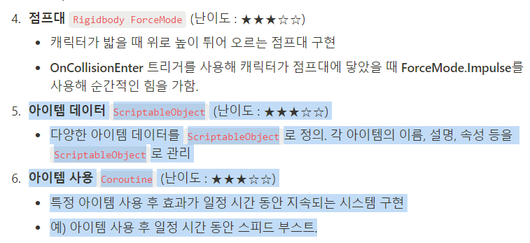 개인 과제에서 플레이어와 관련된 기본 기능을 끝내고 나서 구현해야할 필수 사항들을 보니깐 강의를 바탕으로 캐릭터 점프대나 강의에서 만들었던 아이템 외에 다른 아이템을 만들어야하는 것 같았기에 일단은 저녁을 먹고 난 후에 아이템 데이터를 관리할 수 있는 시스템을 만들어 두었습니다. 내일은 일단 강의를 다시 보면서 인벤토리 시스템과 상호작용을 구현하고 나서 다양한 아이템 추가와 캐릭터가 밟을 때 높이 튀어 오를 수 있는 점프대를 만들어야겠습니다. 또한 시간이 남는다면 선택 요구 사항에서 간단한 것 위주로 구현해야할 것 같습니다.