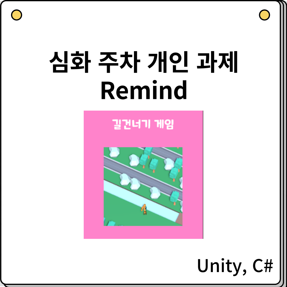 일단 이번 개인 과제에서 선택할 수 있었던 게임이 길건너기 게임, 2D 클릭커, 3D 방치형 게임이었는데, 저는 이번 개인 프로젝트를 길 건너기 게임 (StreetCrossingGame)으로 선정하게 됐습니다. 선정 이유로는 방치형 게임을 좋아하진 않고, 직접 플레이할 수 있는 게임을 좋아한 것도 있으며, 가장 큰 이유로는 지금까지 복습할 시간이 없어서 개인 과제할 겸 복습을 하려고 선정하게 됐습니다.