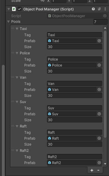 오브젝트 풀은 태그를 받아오는 방식으로 자동차와 땟목을 온/오프로 관리할 수 있게 구성 및 구현을 했습니다. 솔직히 Object Pool이 코드가 이해는 되는데, 직접 짜는 게 너무 어려워서 GPT의 힘을 빌렸습니다. 물론 그냥 가져다 쓰면 의미가 없기 때문에 오브젝트 풀에 대한 것은 분반별 컨텐츠에서 다뤘었기 때문에 코드를 이해하는 데에는 문제가 없습니다.