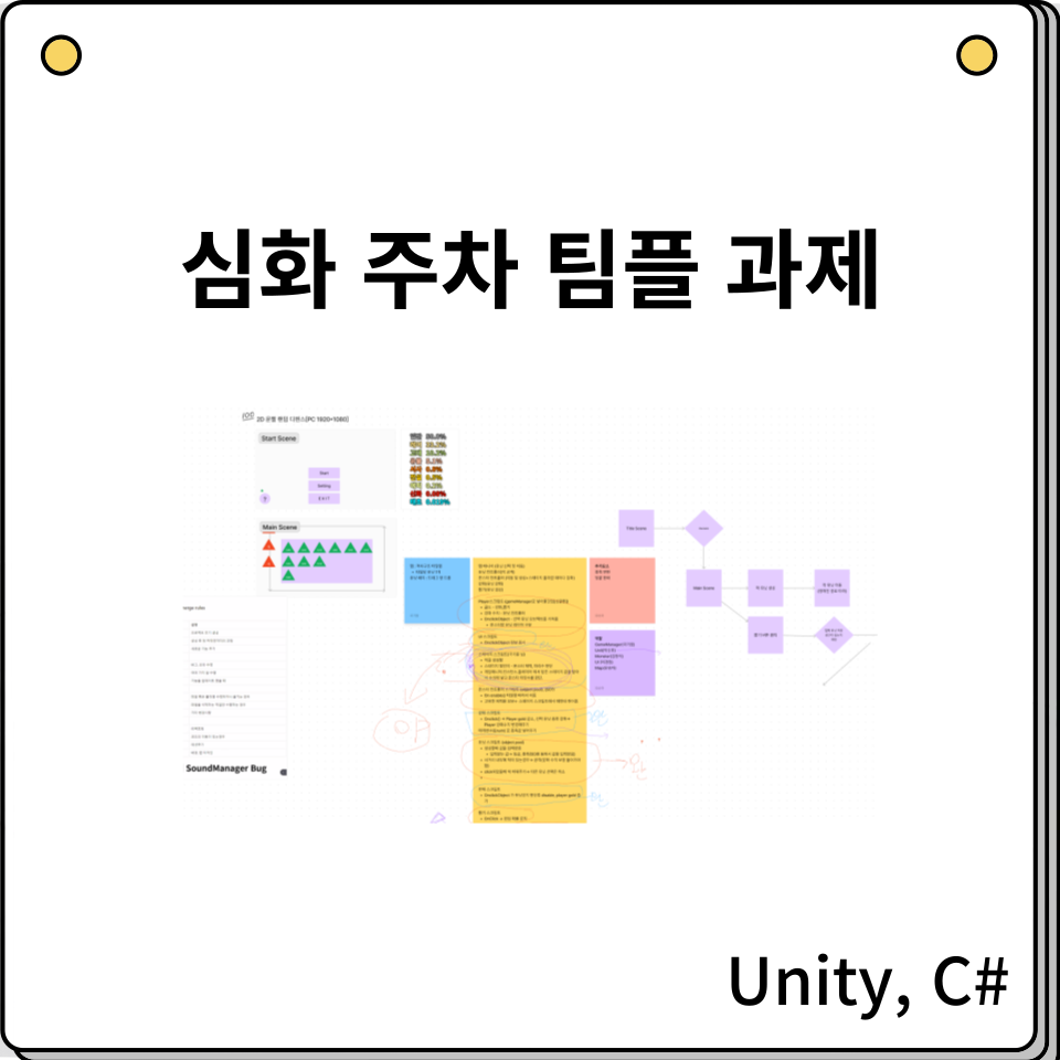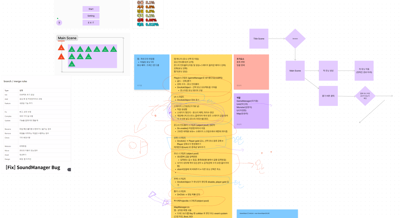 그렇게 장르를 결정했으니 피그마를 통해서 간단한 와이어 프레임과 프레임 워크를 작성했고, 메운디에 필요한 요소가 어떤 게 있는지 조사를 해서 역할을 나누게 됐습니다. 그런데 이렇게 나눈 역할과 기능들이 각각의 스크립트에 있는 게 맞는 지 튜터님께 상담을 했고, 튜터님께서 해당 역할들을 조율 있게 나줘주셨습니다. 그다음에는 팀원들이랑 각자 맡을 역할을 정하고 점심을 먹었습니다.