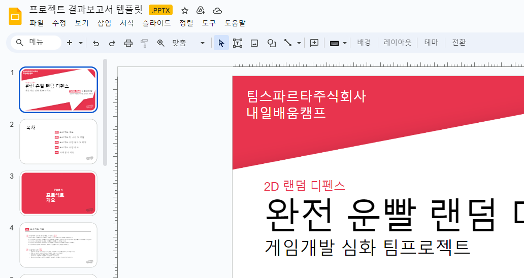 오늘 오전에는 팀원분들 다 같이 온라인 구글 문서 프레젠테이션으로 결과보고서를 작성했습니다. 일단 다들 자체 평가에 대해서 쓰고, 프로젝트 개요나 수행 절차 등등 다 같이 이야기를 통해서 적어야 하는 것들은 회의를 통해서 이야기를 나누어 내용을 채워나갔습니다. 점심을 먹은 뒤에는 제가 최종적으로 결과보고서를 다운 받아서 폰트 정리와 디자인 정리를 했고, 팀원분들에게 공유를 했습니다.