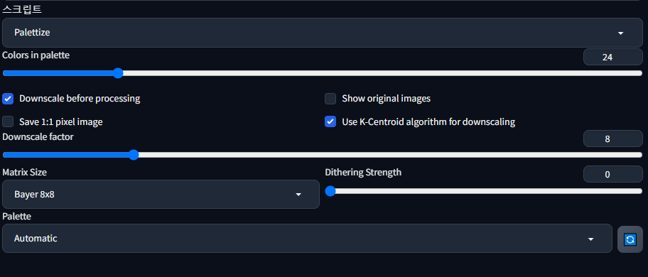 위의 설정을 다 적용하고 위의 3번째 링크를 확장팩으로 저장하면 위 이미지처럼 Palettize를 사용할 수 있고, 맨 밑에 Automatic을 사용해주면 제가 사용했던 설정은 끝, 이대로 생성해 주면...