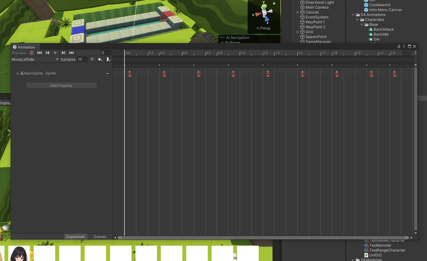 점심을 먹은 뒤에는 원거리 공격용 모나 프리팹을 만들어 놓고 해당 애니메이션을 유니티 내에서 적용하였습니다. 애니메이션을 BaseController를 상속받아서 만들기 때문에 컨트롤러를 수정할 필요 없이 그냥 스프라이트 시트를 나열해서 만들기만 하면 되는 작업이었습니다.