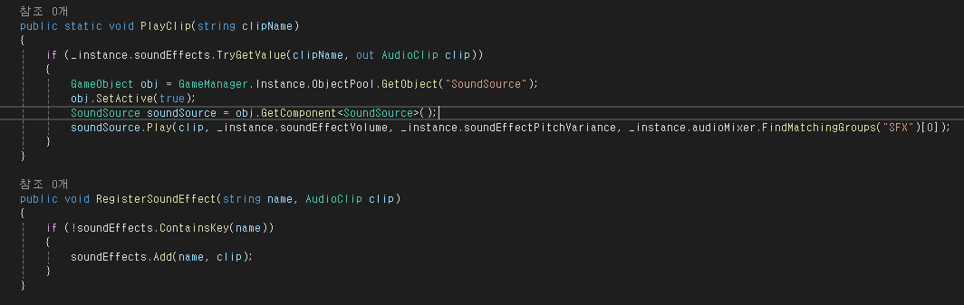 기본적인 구조 자체는 강의에서 나왔던 것과 비슷하긴 한데, 오디오 믹서를 통해서 사운드가 나오고, Sound Source는 오브젝트 풀로 관리를해서 중복된 Sound가 넘치지 않게 사용할 수 있고, 사용 방법으로는 기본적으로 싱글톤 패턴으로 만들어진 SoundManager에서 RegisterSoundEffect 함수를 호출해 Sound를 등록하고, 사용할 때 매니저를 통해서 PlayClip 함수를 사용하면 되는 부분이라 아마 본격적으로 사운드를 적용할 때 자주 쓸 듯싶습니다. 그리고 다른 문제가 있다면 그때 수정해도 늦지 않으니까, 일단 이렇게라도 구성을 했습니다.