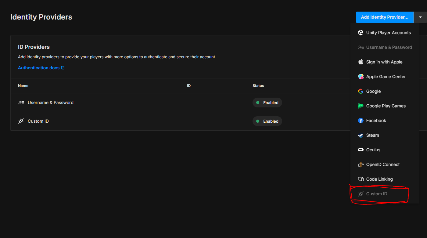 처음에는 계정을 연동한 유니티 Cloud에서 계정 로그인 방식을 어떻게 할 건지, 제공 방식을 정해야 하는 데, 저는 영상에서 알려주던 함수인 SignInAnonymouslyAsync()를 사용해 보니까 그냥 어떤 ID 값을 받아서 로그인하는 방식이라... 제가 생각하는 거랑은 거리가 멀어 보였습니다. 제가 생각하는 로그인 방식은 아이디와 비밀번호가 있고, 회원 가입도 가능한 일반적인 로그인 시스템을 생각했기 때문에, 해당 사이트에서 Custom ID라고 직접 만들어서 사용할 수 있는 거를 위의 이미지처럼 추가해야지만 관련 코드를 쓸 수 있었습니다.
