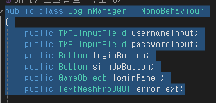 이다음에는 유니티에서 필요한 UI를 만들고, 그 UI에 대한 정보들을 받아올 LoginManager를 만들었습니다.