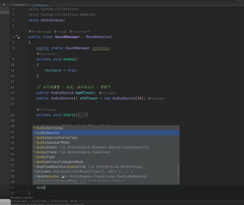 그리고 저녁을 먹고나서 7시에 다른 쪽 튜터님께서 사운드 매니저 특강을 잠깐 하신다고 하셔서 제가 구축했던 거에서 보강할 게 있을 것 같아 강의를 들으러 가서 튜터님이 구축하시는 것과 비교하려고 스크립트를 찾는데... "어라? 내가 만들어둔 SoundManager가 어디 갔지??" 하면서 돌발 상황 발생...
