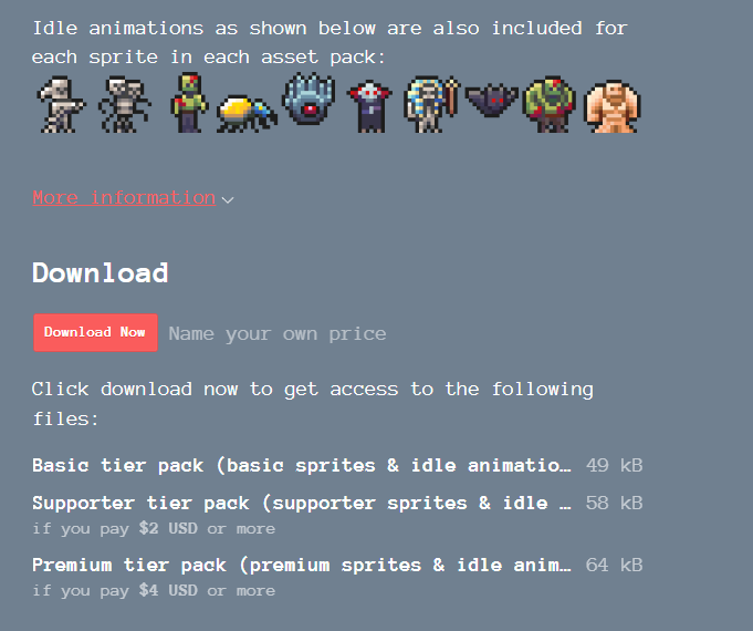 오늘 오전에는 어제 만들었던 로그인 시스템 오류를 조금 고치고, 몬스터에 대해서 에셋을 사용하기로 했었기 때문에, 기존에 쓰려고 했었던 무료 에셋을 사용하려고 했지만, 여기에는 공격 애니메이션이나 죽는 애니메이션이 없는 문제가 있었습니다. 그래서 어떻게 할까 생각하다가 여러 가지 유료 에셋도 찾아보고 했는데, 적당하면서도 괜찮은 게 없어서 팀원분들과 상담을 해 본 결과, 그냥 위 사이트의 무료 버전 몇 개랑 유료 하나를 사서 캐릭터처럼 직접 애니메이션을 만드는 방향으로 정하게 됐습니다.
