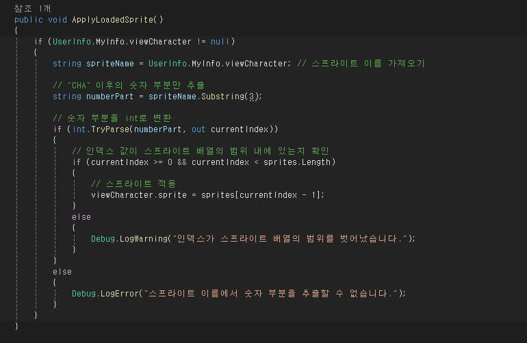 일단은 각자 맡았던 부분에 피드백 수정을 진행하셨고, 저는 뷰 캐릭터의 저장이 계정마다 저장되는 것이 아니라 게임 자체 저장이 되어 있어서 이 부분을 수정했습니다. 이론상 기존 저장 하는 방식이라 같을줄 알고, 뷰 캐릭터의 Sprite를 받아와서 저장해보는데, 알고 보니까 Sprite는 파일 자체를 저장해야 하더군요. 그래서 이것도 Rcode로 되어 있으니까 String으로 Rcode를 받아와서 재구성했습니다.