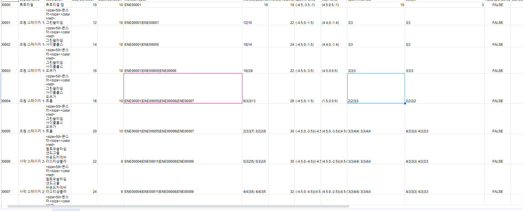 수요일 날 새벽 2시까지 하는 등 최대한 많이 작업했지만, 부족한 점이나 빌드하고 나서의 버그 때문에 어제도 오전 10시 반쯤에 들어가서 작업을 시작했습니다. 팀원 분 한 분이 들어와서 버그를 고치고 계셨고, 저는 구글 시트 중에 MAP 데이터가 비어있어서 맵이 돌아갈 수 있게 조건에 맞는 값을 입력해서 넣었습니다. 일단 임시로 넣는 데이터다 보니 캐릭터나 몬스터 등등 밸런스가 제대로 안 잡혀 있었습니다.