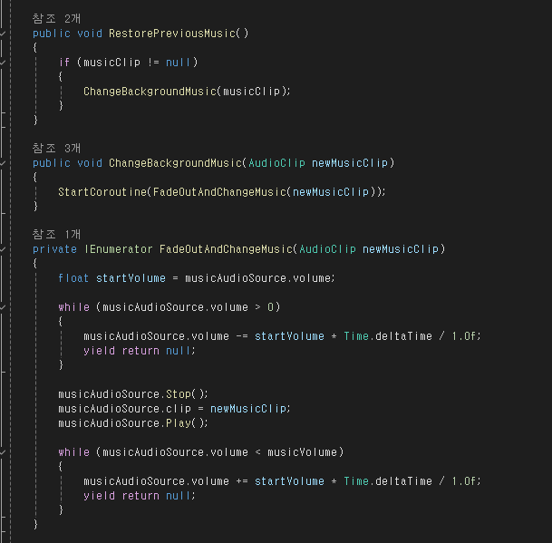 임시로 밸런스를 얼추 맞춘 다음에 저는 스테이지 별로 배경음악이 바뀌게 끔 만들어 보았습니다. 사운드 매니저를 만들었을 때, 배경음악이 자연스럽게 바뀌도록 코루틴을 사용하여 Fade On Out을 만들어 놨었고, 이것을 사용하여 스테이지 버튼이 있는 곳에 Rcode를 분석해서 각 스테이지 별 테마에 맞는 노래를 적용시켰습니다. 배경 음악 변경 기능을 만들던 도중에 다른 팀원 분이 오셔서 밸런스 부분을 담당해 주셨고, 캐릭터와 몬스터 로직을 계산해서 밸런스를 맞춰주셨습니다.