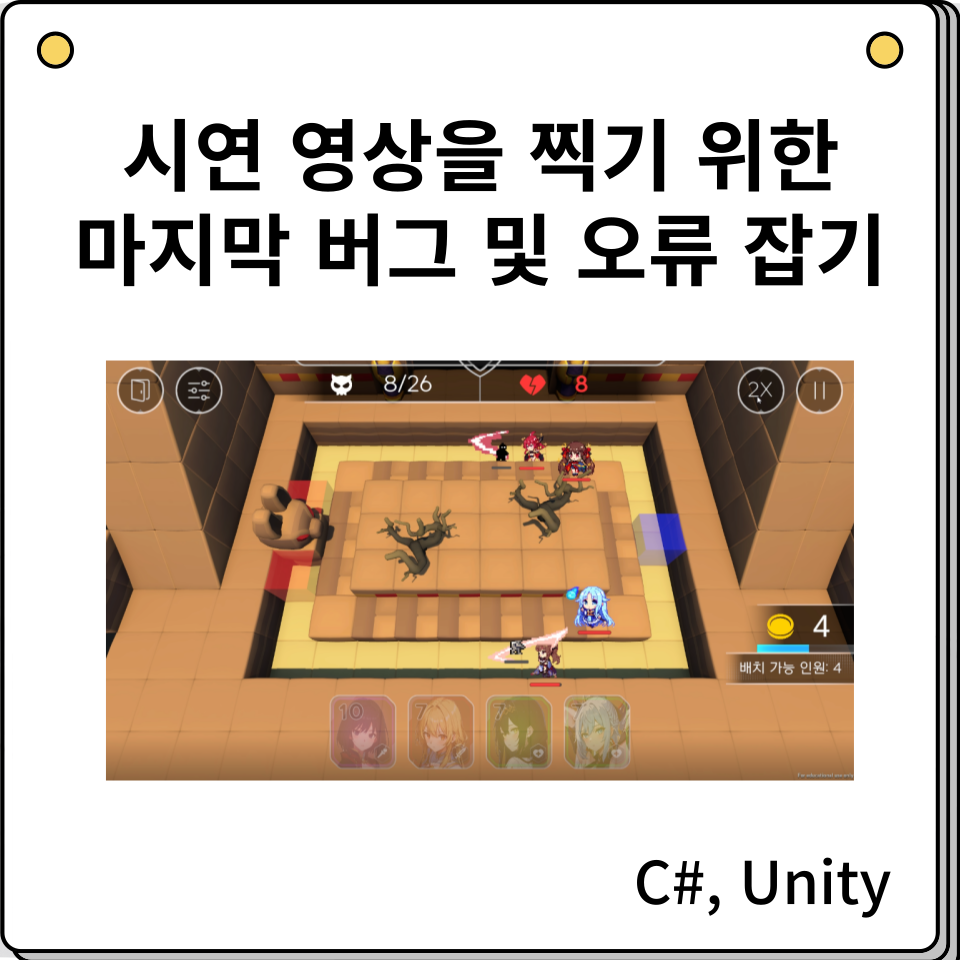 저녁 먹기 전에 영상을 찍을 생각으로 해당 로직을 수정 및 작은 버그들을 고치면서 팀원분들과 공유를 했는데, 서로 작업하면서 일부 캐릭터의 투사체 생성 위치 오류라던가 애니메이션이 제대로 작동 안 한다거나 등등 잔 버그들이 생겼고, 이를 고치면서 진행하느라 어느덧 저녁시간이 되어서 빠르게 저녁을 먹었습니다.