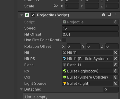 일단 투사체의 경우, 기존에 충돌 함수에서 쓰이는 Hit 파티클이 제대로 작동 안 하는 것 때문에, 예전에 문제가 돼서 삭제했던 Rigidbody를 다시 넣어주면서 충돌 사이클에 맞는 투사체 로직으로 바꾸었습니다. 충돌 쪽에서 처리하니까 투사체 피격 파티클이 제대로 작동하더군요.