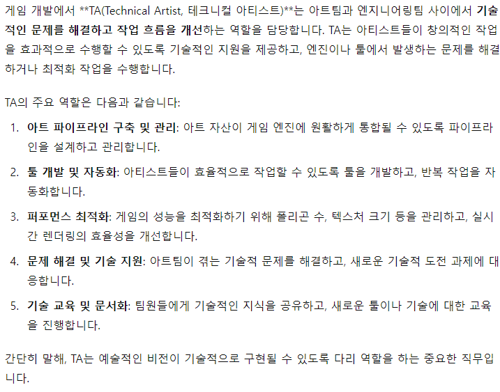 아마 이제 마지막으로 손 좀 보면서 수정할 거 수정하고, 추가할 거 추가해서 얼추 마무리를 했고, 남은 시간에는 저번에 못했던 면접 테스트 준비를 시작했습니다. 저번에 했던거의 연장선이라 생각하고 면접 테스트를 봤는데, CS 지식에 대해서는 2개는 답을 했고, 1개는 답을 못했습니다. 그리고 기타 질문 중에서 Git Repository 관련해서 어떤 문제가 있었고, 어떻게 해결했는지에 대해서는 저번에 있었던 충돌 관련해서 대답을 했었고, 튜터님께서 궁금한게 있으면 물어보라고 하셔서 저는 TA 직종을 하려면 어떻게 해야하는지 물어보았습니다. 튜터님께서는 경험을 많이 쌓고, 별도로 셰이더 공부를 해서 TA로 전직하는 게 좋다고 하셨습니다.