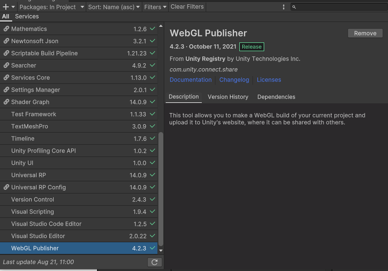 그다음에는 패키지 매니저에서 WebGL Publisher를 다운 받고 빌드를 해보는데, DOTWeen과 관련된 오류가 발생했습니다.
